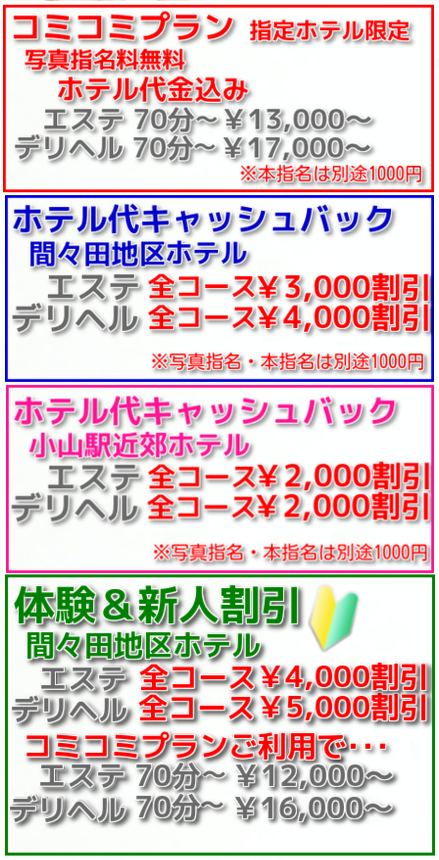 ◆完全業界未経験★柔肌癒し系女の子♪◆ 16時~22時受付♪ 体験&新人割引 ★間々田ホテル割引★ 【エステ】70分~9000円~ 【デリヘル】70分~13000円~! ☆コミコミプラン☆ 【エステ】70分~12000円~ 【デリヘル】70分~16000円~! ※指定ホテルのご利用に限ります。